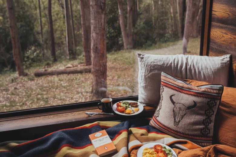 The dark wood panelling and furnishings, red-draped fourposter bed, and black stone bathroom evoke the charm of a secluded Sierra Nevada.